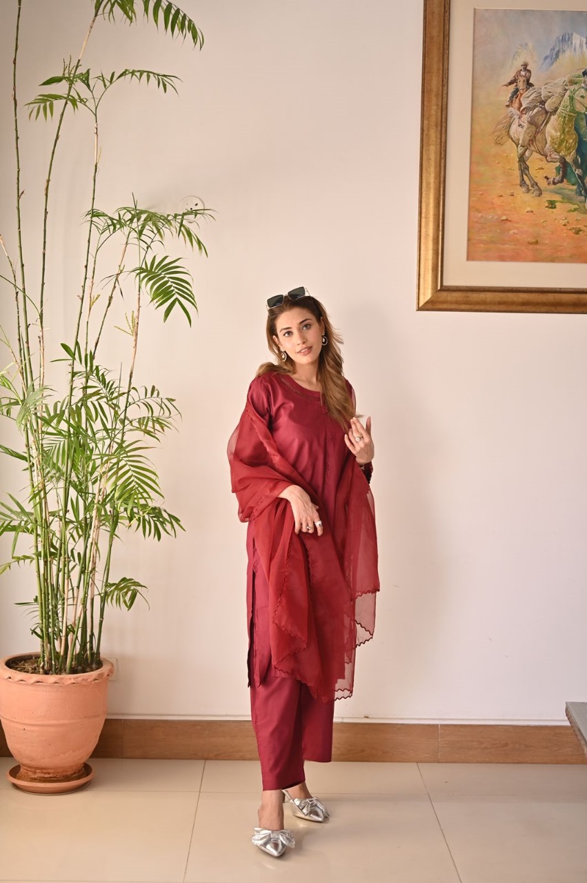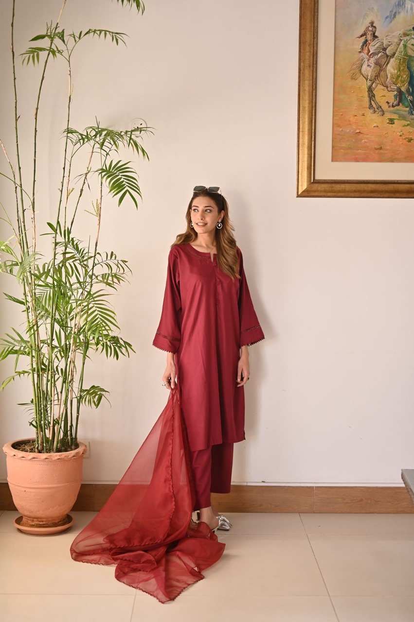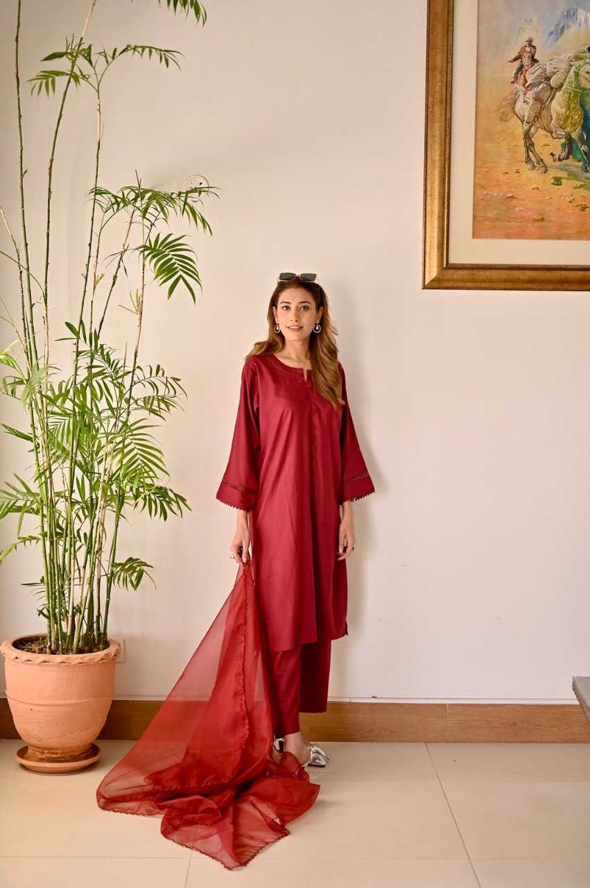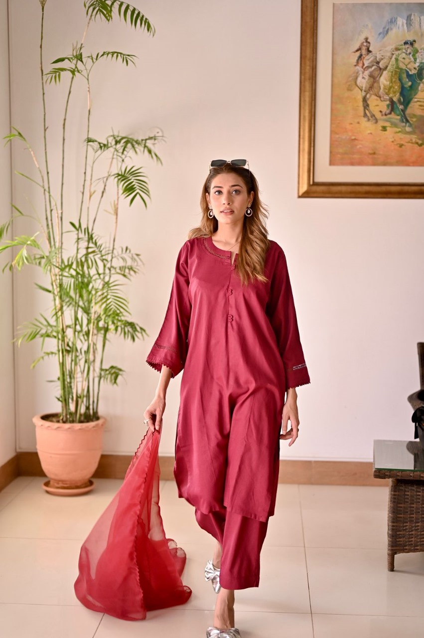 Versatile yet effortlessly chic, the Regal Garnet Maroon Lawn Dress is a wardrobe essential for the modern woman. Pair it with statement jewelry and heels for a glamorous evening look, or dress it down with flats for a more casual yet elegant ensemble.
