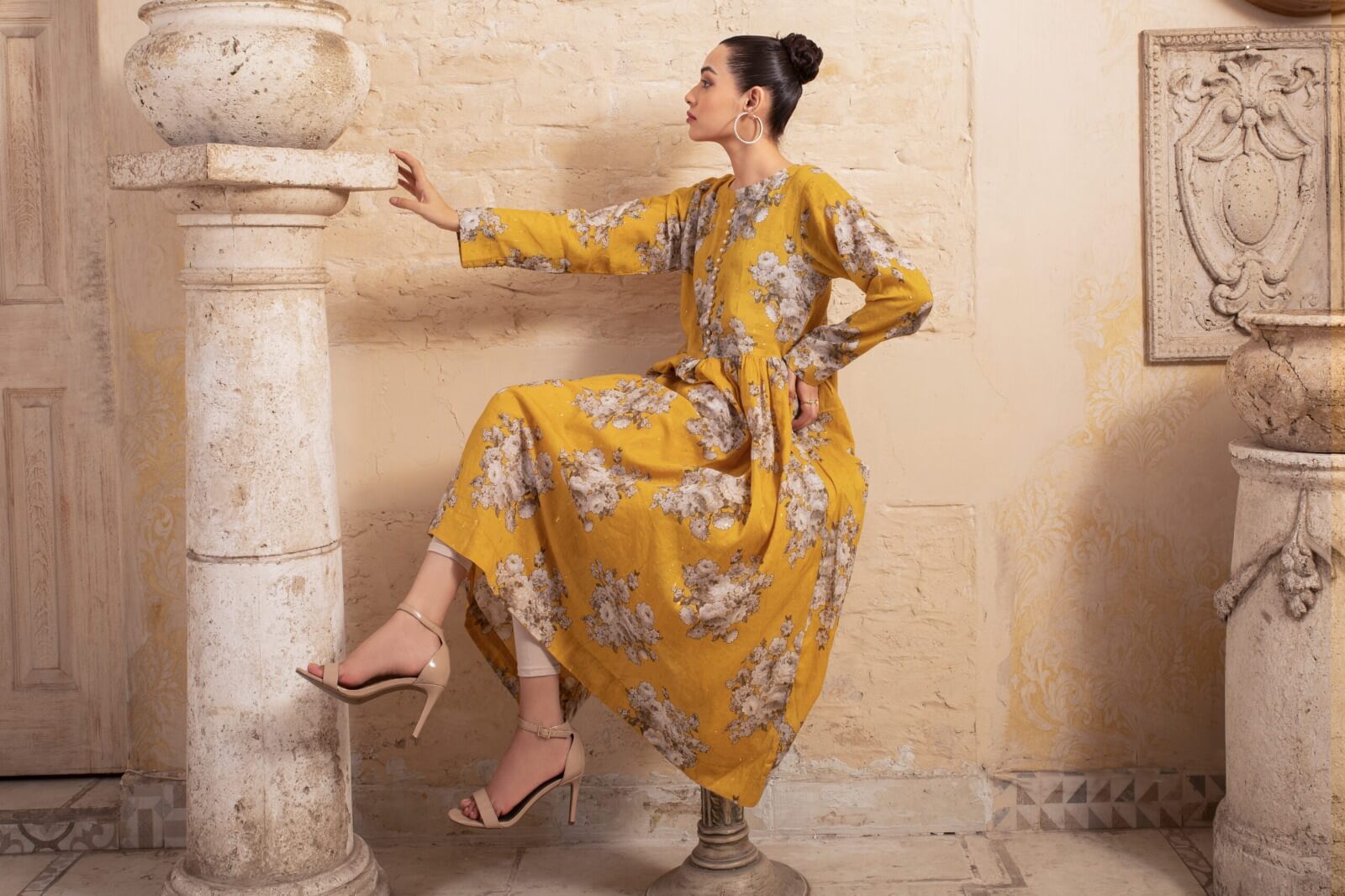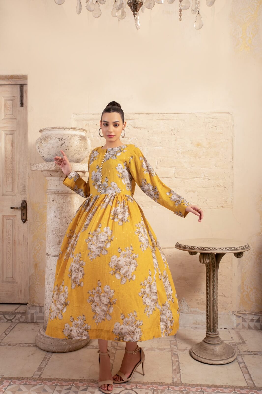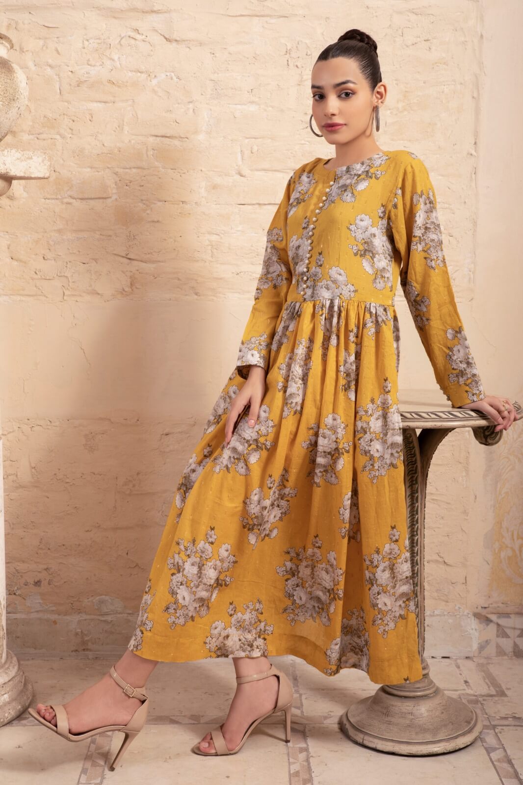Imagine a mustard yellow lawn printed frock that embodies the warmth of a sunlit meadow. Its vibrant hue, reminiscent of golden sunshine, radiates joy and vitality, instantly brightening any room. Delicate floral patterns adorn the fabric, evoking images of wildflowers dancing in the breeze. Each detail is a celebration of nature’s beauty, capturing the essence of a blooming garden in full bloom. As the frock sways with every movement, it exudes a sense of effortless charm and grace, enveloping the wearer in a cloak of happiness. With its cheerful color and playful print, this frock becomes a beacon of positivity, spreading smiles wherever it goes.