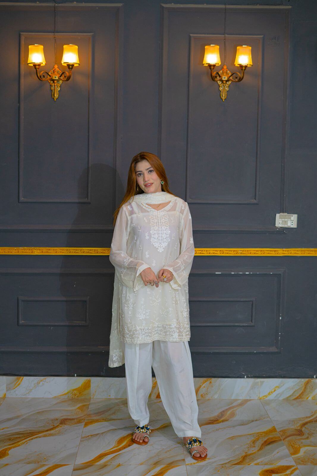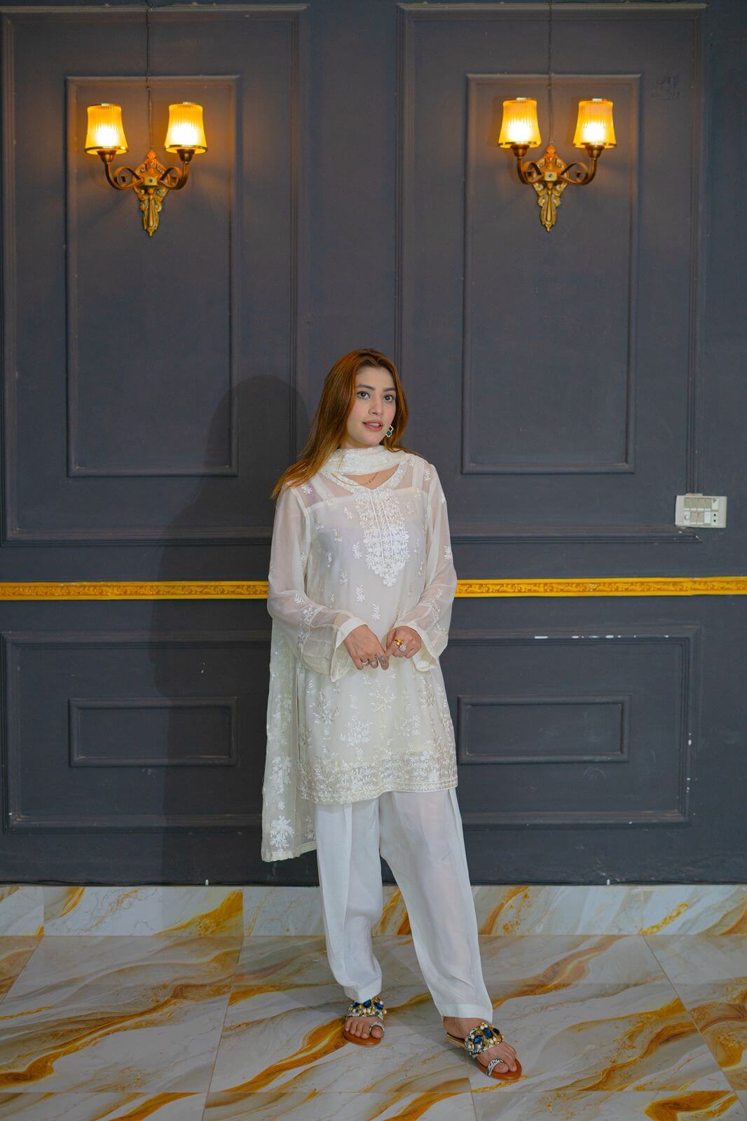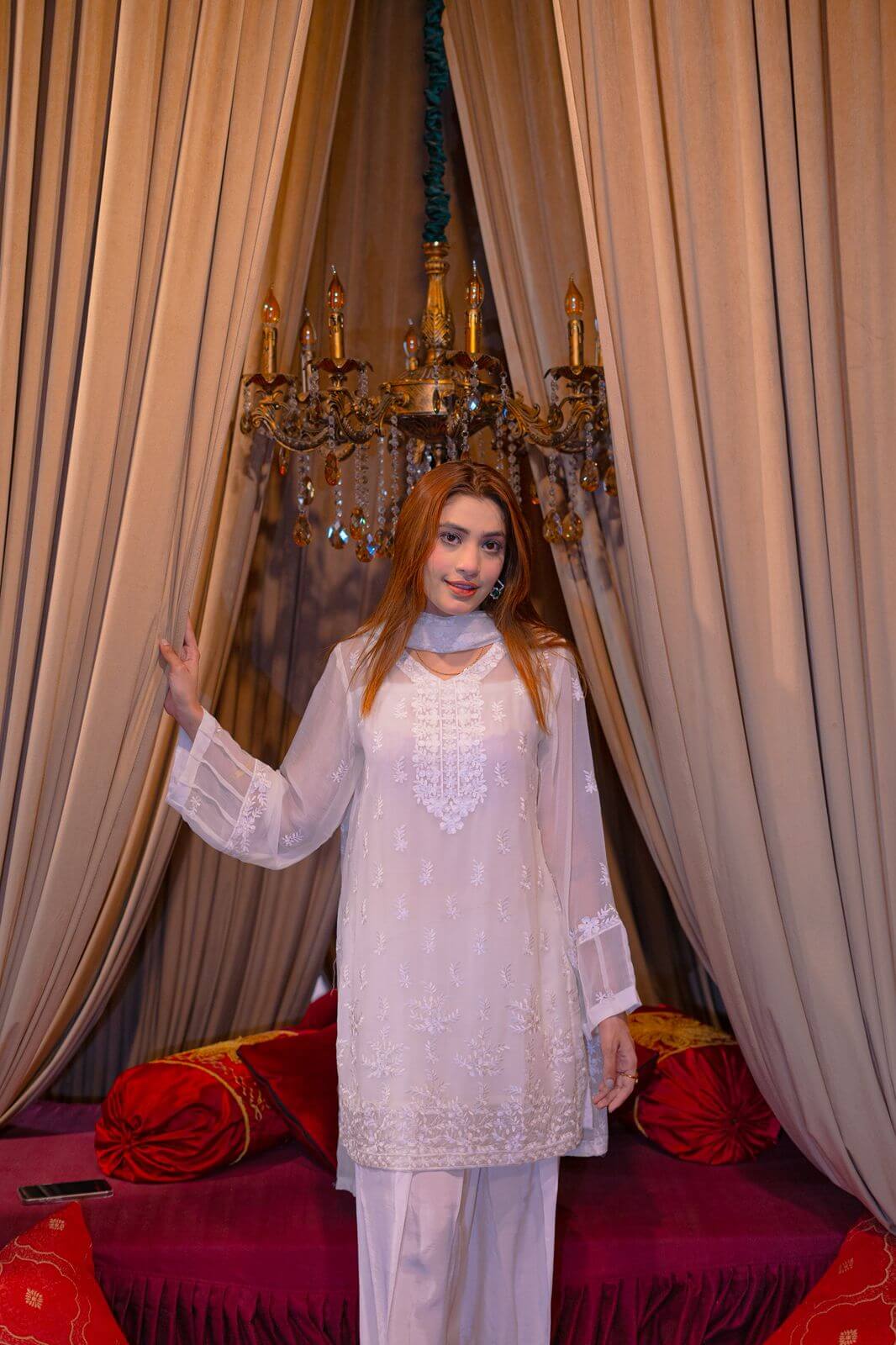 Step into timeless elegance with Ivory Whisper, a stunning white chiffon ensemble that captures the essence of grace and femininity. The dress features delicate embroidery intricately spread across soft, flowing chiffon, offering a perfect blend of subtle shimmer and sophisticated charm. Paired with a fully embroidered dupatta, this outfit radiates understated luxury, making it ideal for festive gatherings, bridal showers, or formal soirées. The sheer, ethereal dupatta is a statement piece on its own, adorned with detailed threadwork that complements the dress beautifully. Whether you’re walking into a summer celebration or Meelad ceremony, this outfit ensures you leave an impression that lingers.