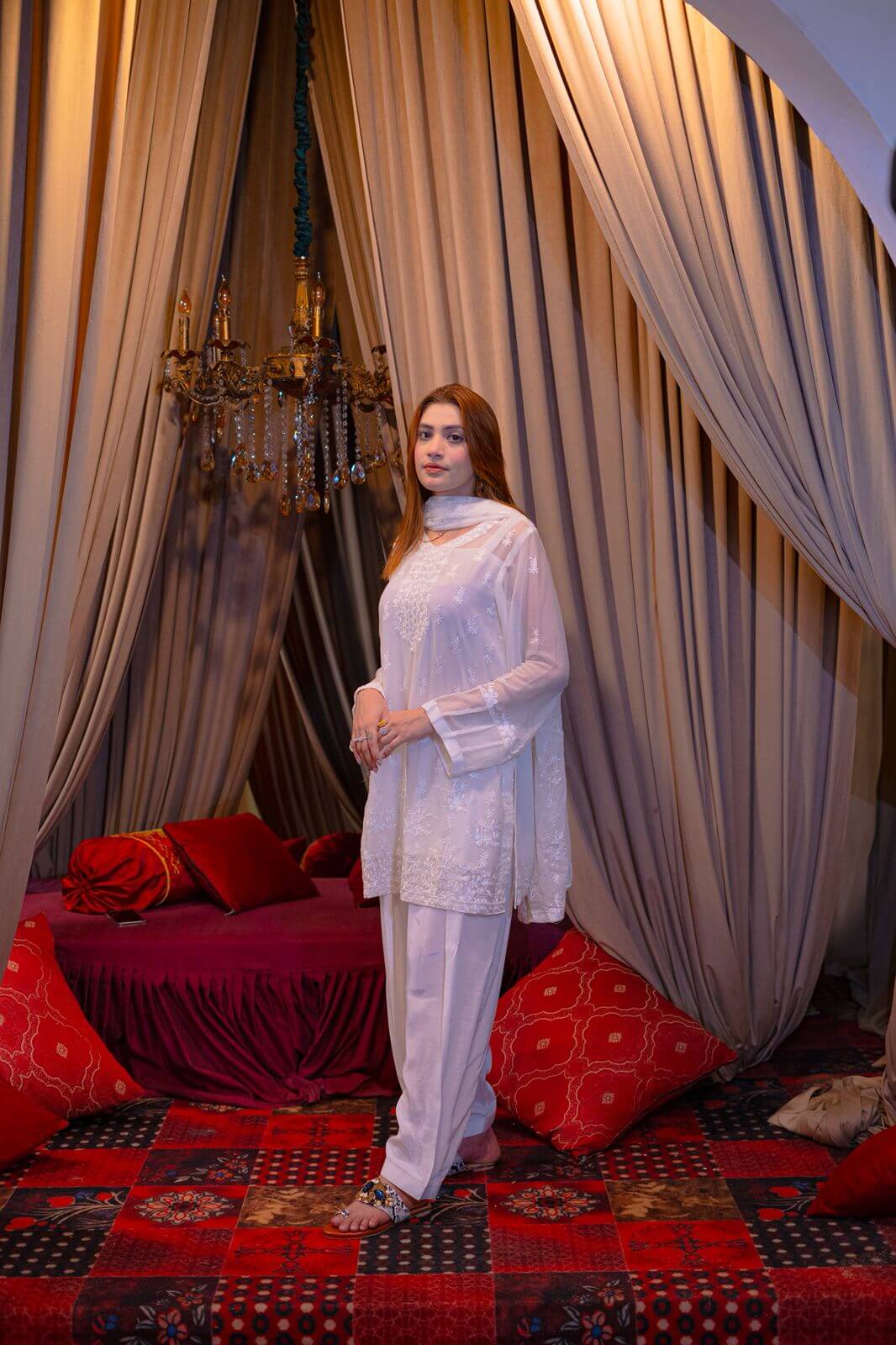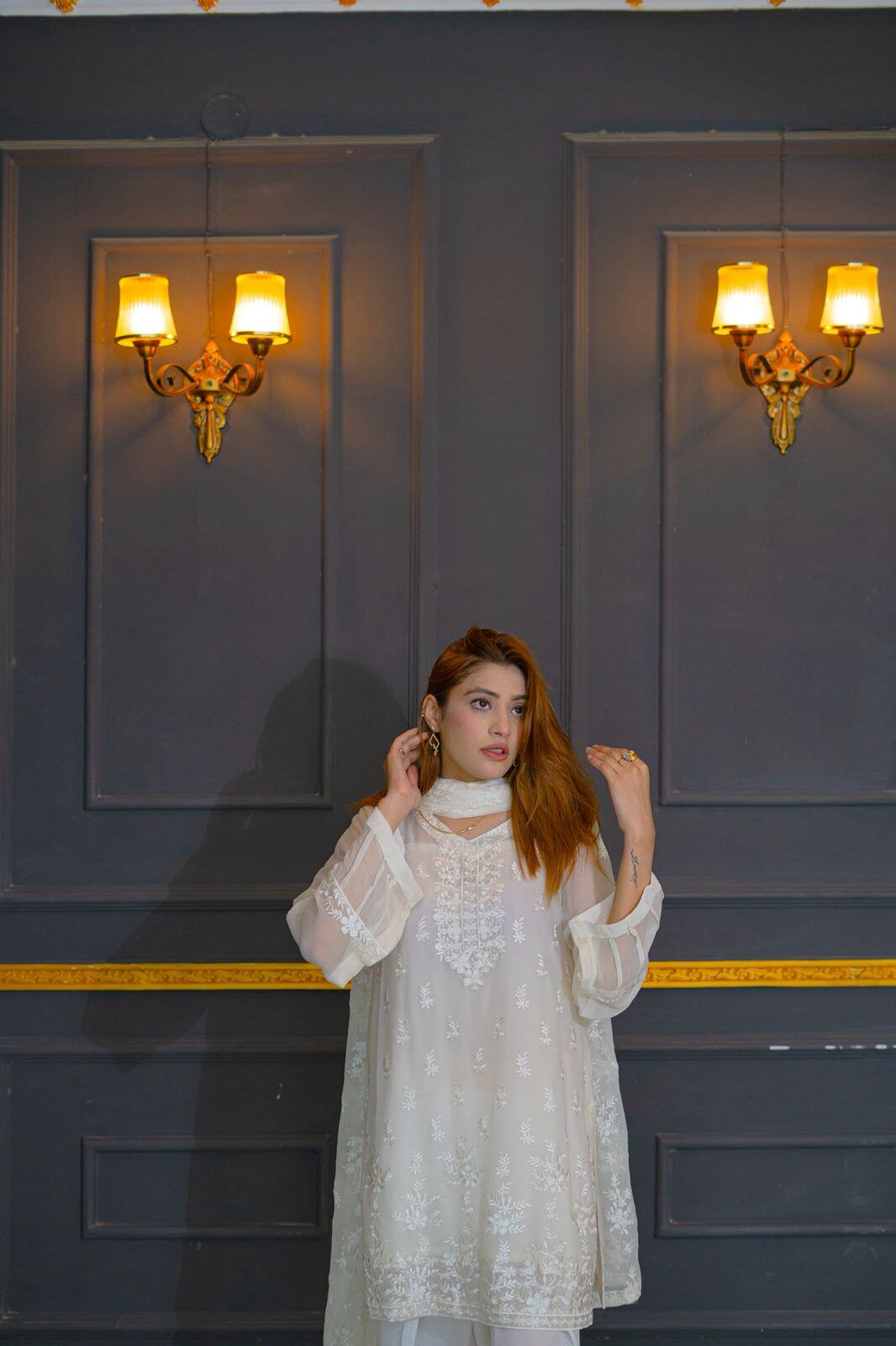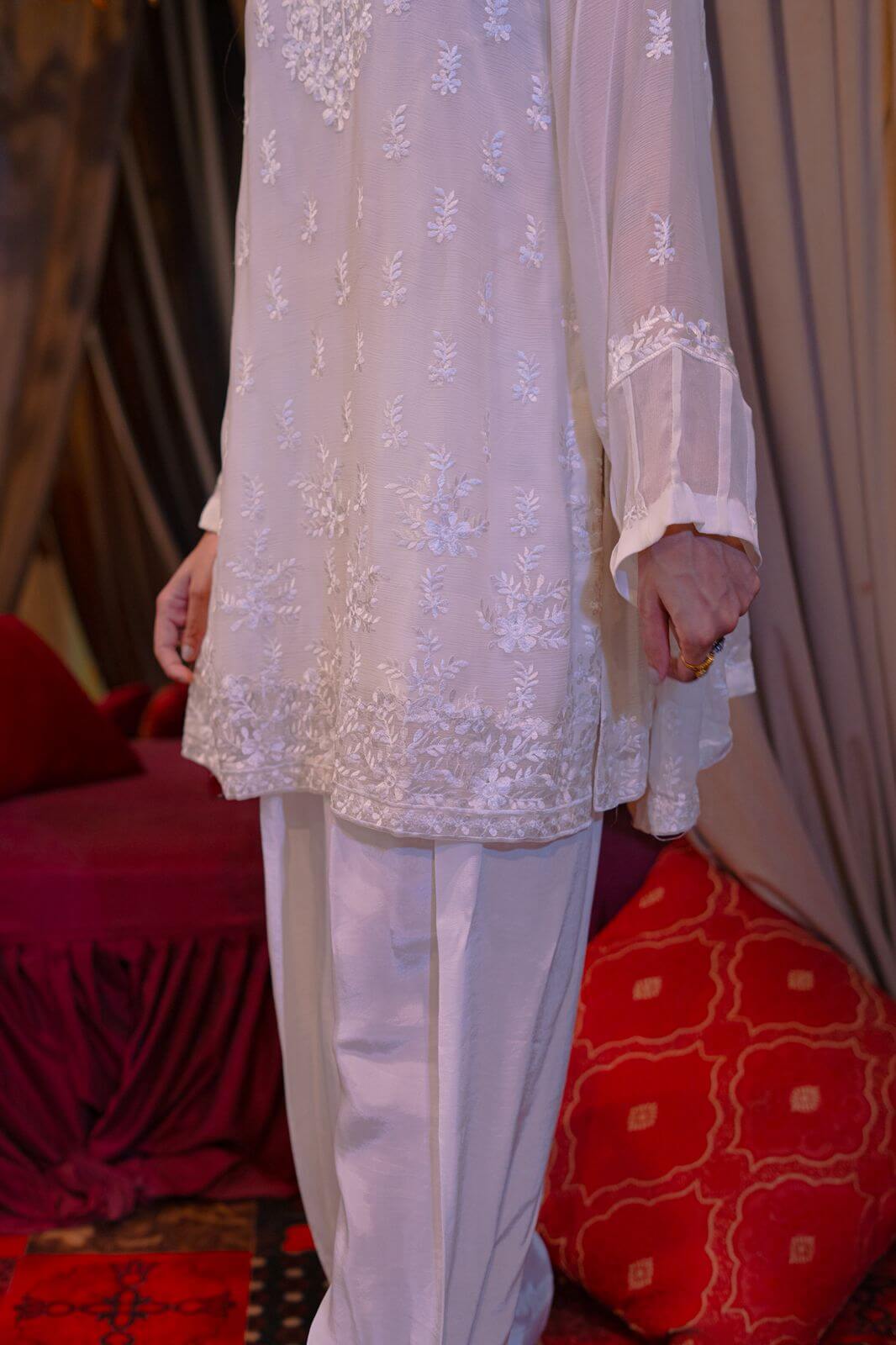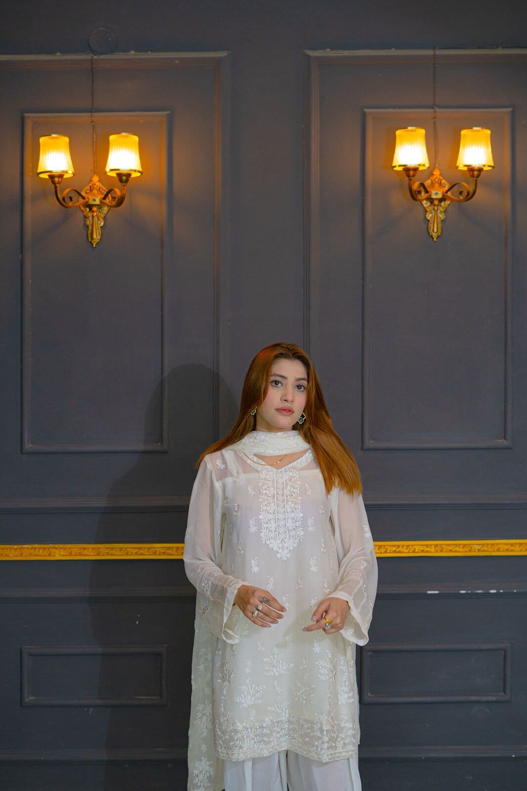 Step into timeless elegance with Ivory Whisper, a stunning white chiffon ensemble that captures the essence of grace and femininity. The dress features delicate embroidery intricately spread across soft, flowing chiffon, offering a perfect blend of subtle shimmer and sophisticated charm. Paired with a fully embroidered dupatta, this outfit radiates understated luxury, making it ideal for festive gatherings, bridal showers, or formal soirées. The sheer, ethereal dupatta is a statement piece on its own, adorned with detailed threadwork that complements the dress beautifully. Whether you’re walking into a summer celebration or Meelad ceremony, this outfit ensures you leave an impression that lingers.
