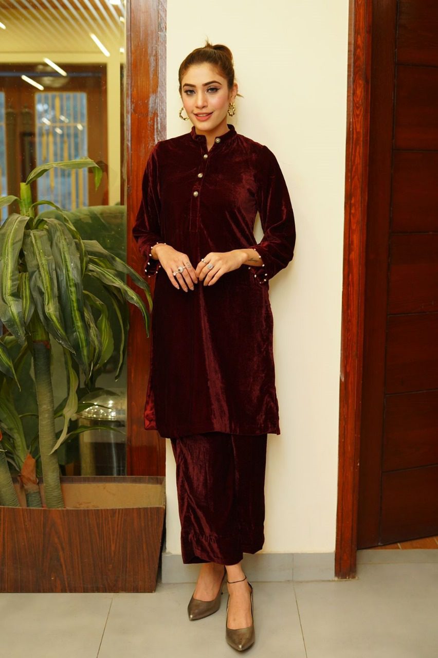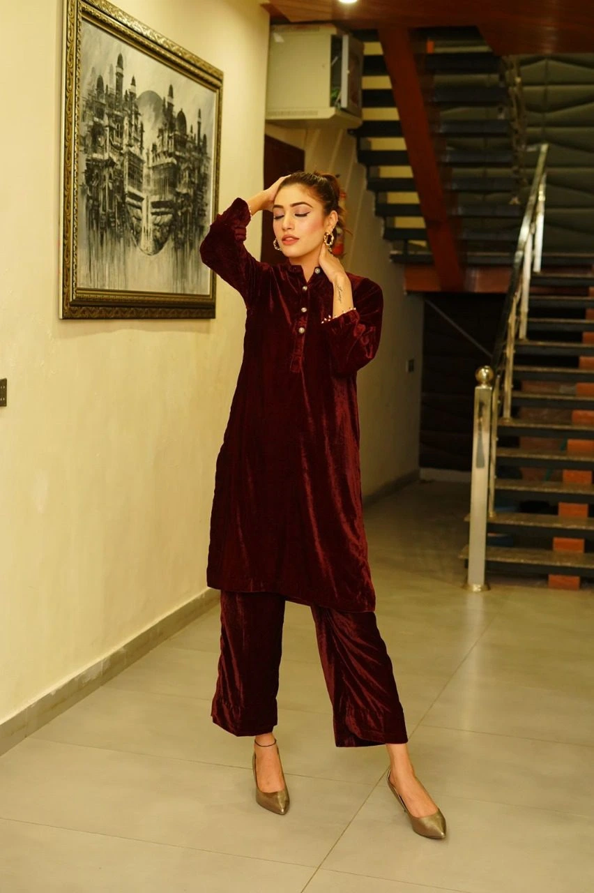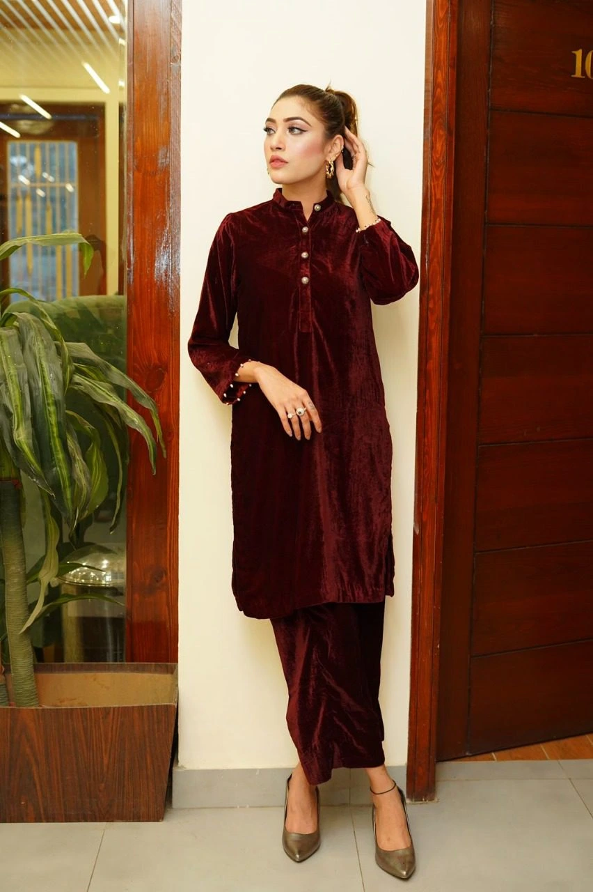 The velvet maroon dress is a stunning piece that exudes elegance and sophistication. Crafted from luxurious velvet fabric, it features a rich, deep maroon hue that catches the light beautifully, adding a touch of glamour. Accessorizing with gold or silver jewelry can elevate the look, while a pair of classic heels completes the ensemble, making it a perfect choice for a night out or a special celebration.